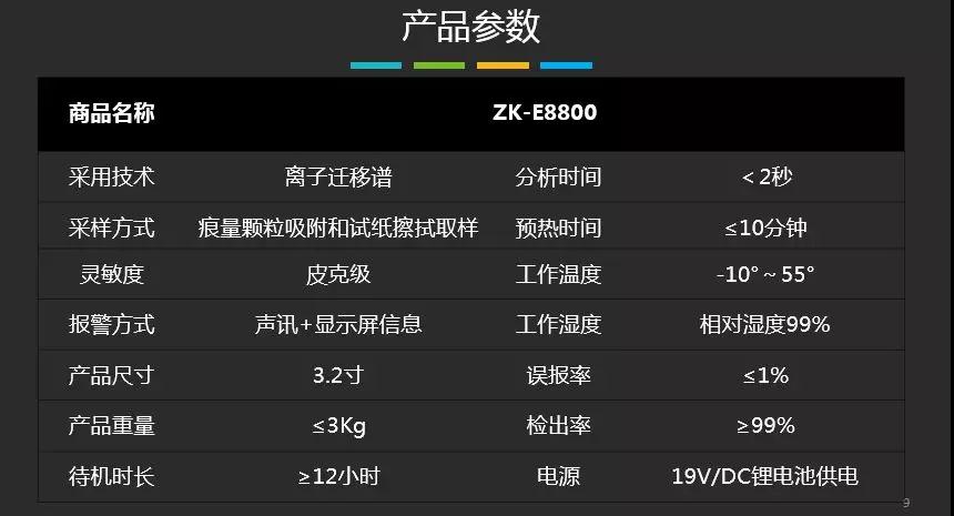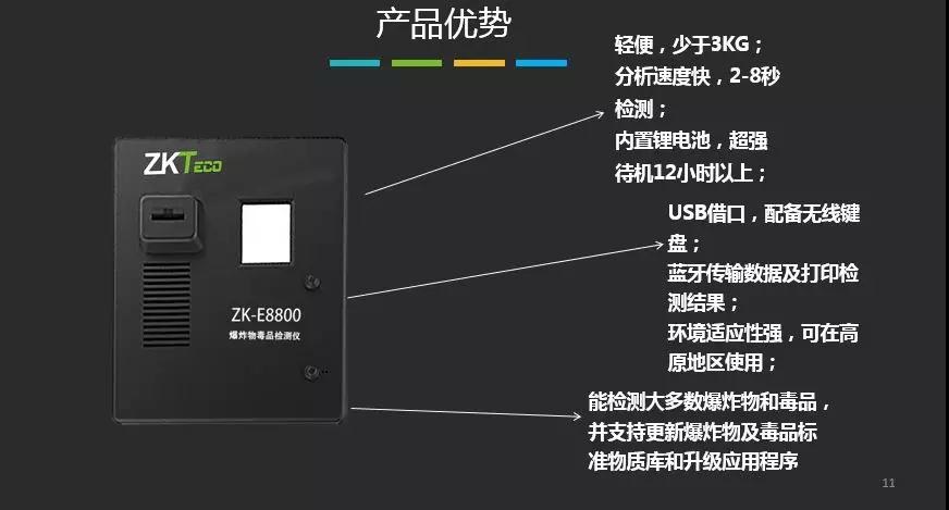 便攜式爆炸物毒品探測儀ZK-E8800是由中控門禁自主研發(fā)、生產(chǎn)的爆炸物和毒品檢查設(shè)備。該產(chǎn)品基于國際上先進的離子遷移譜(IMS)技術(shù)原理,能夠快速、精準(zhǔn)地檢測并判斷痕量爆炸物及毒品的種類,具有快速、準(zhǔn)確地檢測痕量爆炸物、毒品的功能,產(chǎn)品性能達到同類產(chǎn)品國際先進水平,具有易于使用,耗材成本低和維護方便等優(yōu)勢。