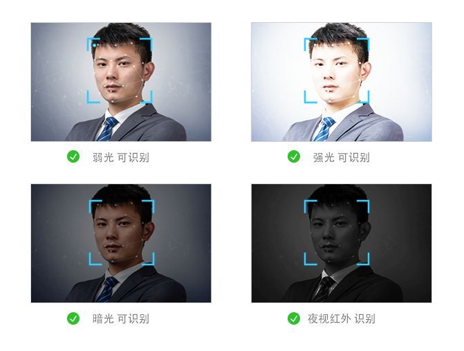 為了應(yīng)付復(fù)雜的環(huán)境,采用的人臉識別技術(shù)一定要支持強(qiáng)光、弱光、黑夜背光等多種復(fù)雜環(huán)境,并且可以檢測出正臉、側(cè)臉等多